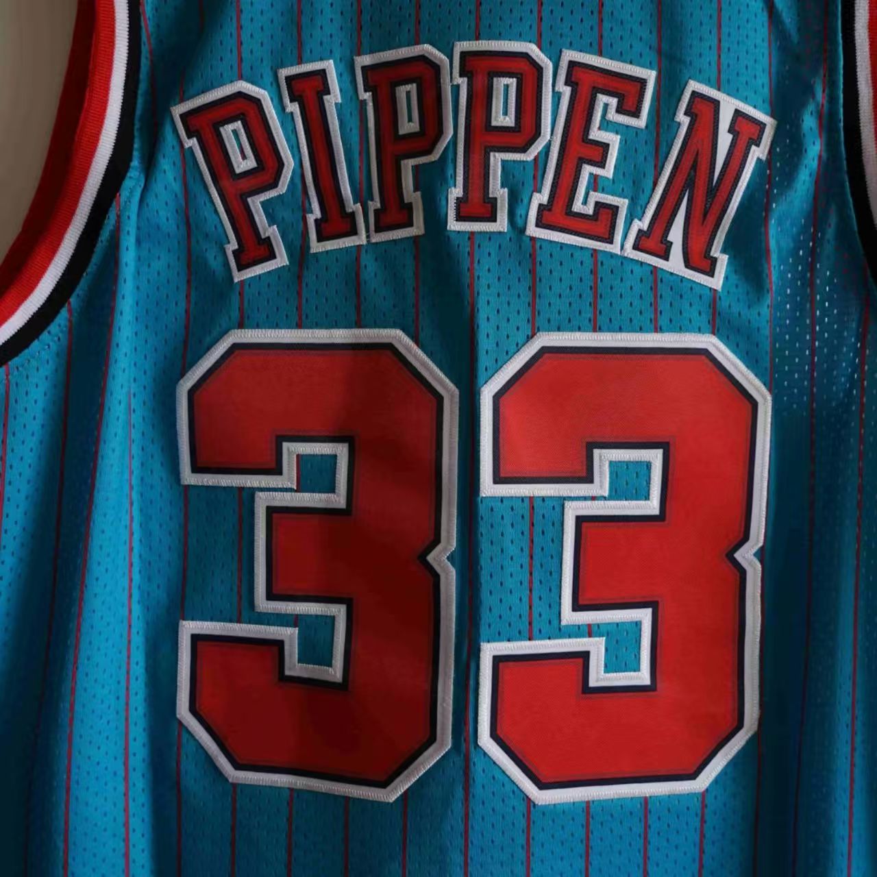 Rare Colorway: Unique blue vertical pinstripes stand out from the traditional red/black Bulls jerseys — a true collector’s piece.