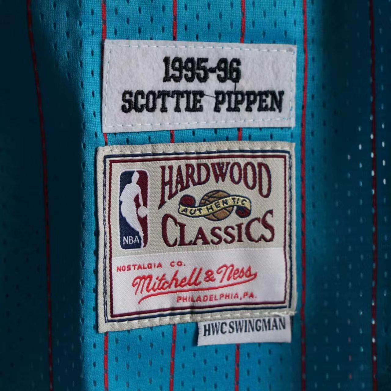 Premium Craftsmanship: Heat-pressed team name and numbers with authentic woven Hardwood Classics jock tag.