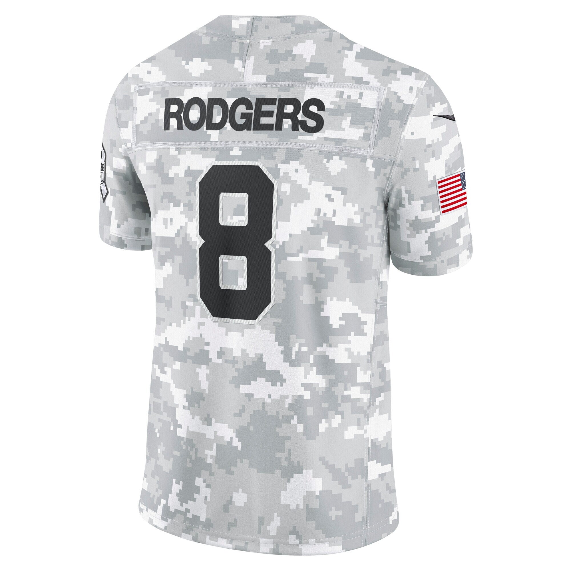 This Aaron Rodgers Salute to Service Limited Jersey delivers an authentic touch on game day with premium twill team appliques and a tribute to those who serve their country. Its special design is dedicated to the NFL's charitable initiative and features an allover arctic camo pattern and military-inspired details. Double pique fabric and sweat-wicking Dri-FIT technology provide consistent comfort as you represent the New York Jets and active or retired service members. The NFL does not profit from the sale of Salute to Service products. Charitable contributions are awarded by the NFL Foundation to the NFL's military partners. For more information, please visit www.NFL.com/Salute.