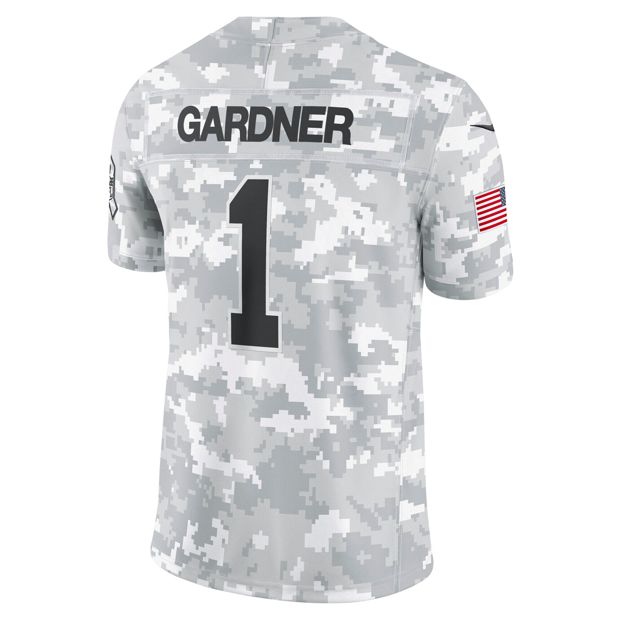 This Ahmad Sauce Gardner Salute to Service Limited Jersey delivers an authentic touch on game day with premium twill team appliques and a tribute to those who serve their country. Its special design is dedicated to the NFL's charitable initiative and features an allover arctic camo pattern and military-inspired details. Double pique fabric and sweat-wicking Dri-FIT technology provide consistent comfort as you represent the New York Jets and active or retired service members. The NFL does not profit from the sale of Salute to Service products. Charitable contributions are awarded by the NFL Foundation to the NFL's military partners. For more information, please visit www.NFL.com/Salute.