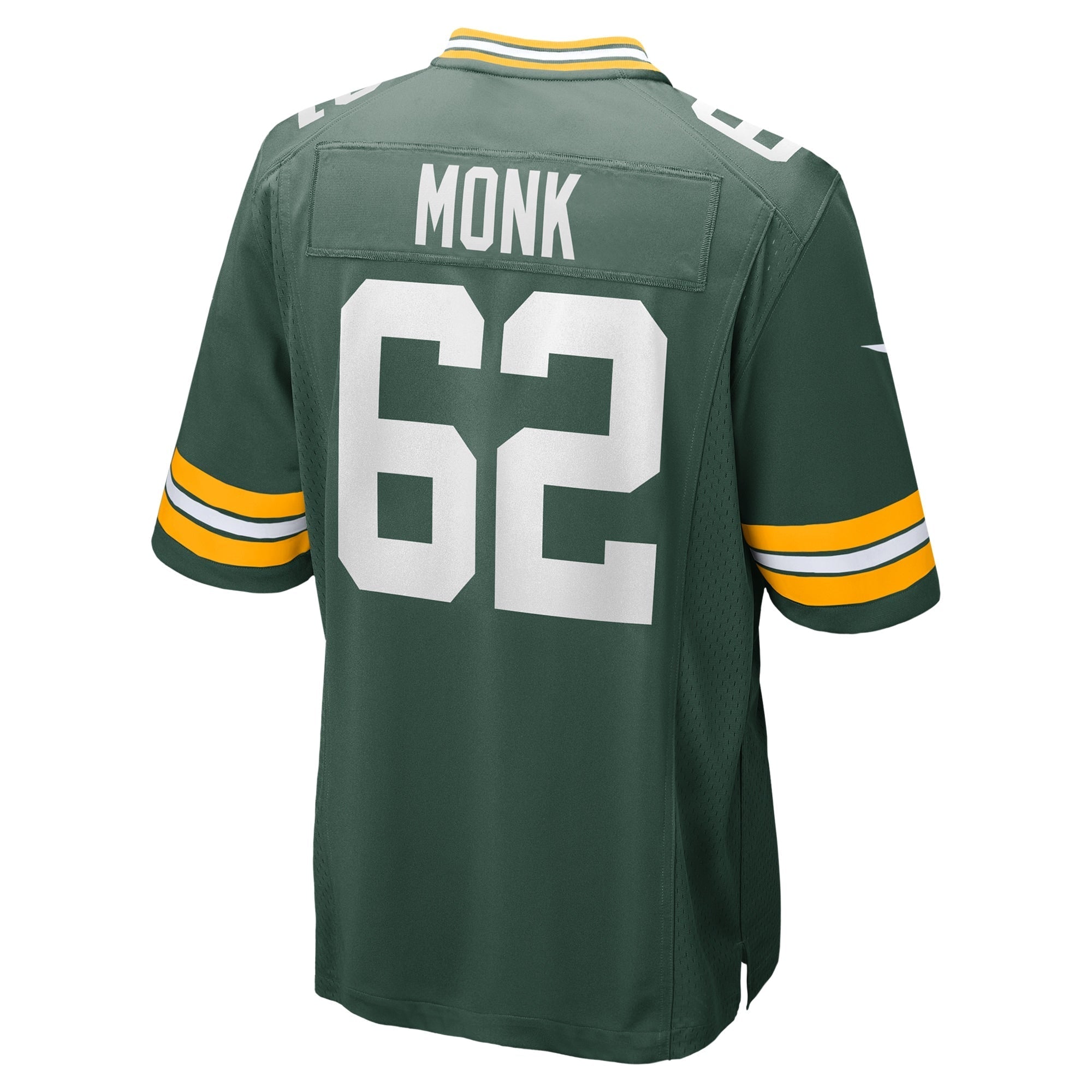 Channel your Green Bay Packers spirit with this Jacob Monk Team Game Jersey from Nike. This jersey is designed for movement and features mesh side panels for extra breathability, allowing you to stay cool and comfortable. The sewn-on NFL Shield at the collar and satin twill woven jock tag at the hem provide authentic finishing touches, while the heat-sealed name, numbers and team details showcase your Green Bay Packers pride.