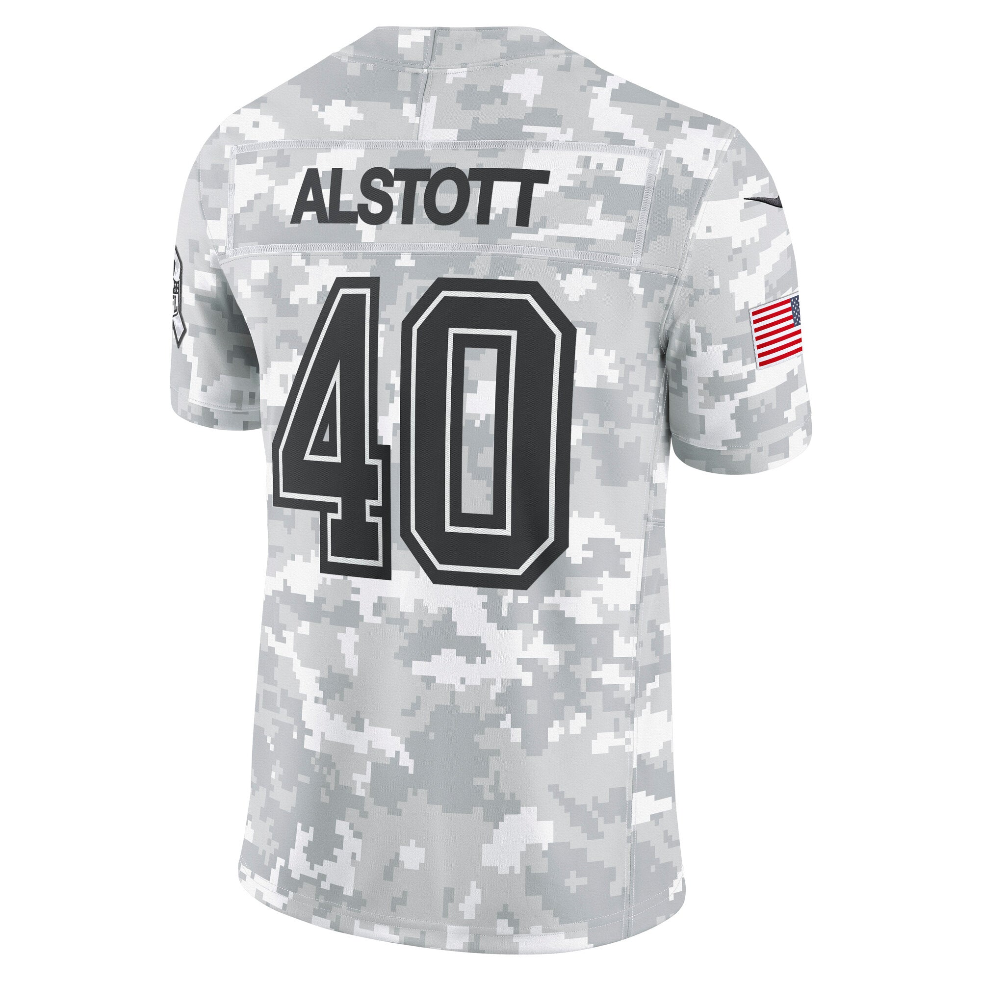 This Mike Alstott 2024 Salute to Service Retired Player Limited Jersey delivers an authentic touch on game day with premium twill team appliques and a tribute to those who serve their country. Its special design is dedicated to the NFL's charitable initiative and features an allover arctic camo pattern and military-inspired details. Double pique fabric and sweat-wicking Dri-FIT technology provide consistent comfort as you represent a legendary Tampa Bay Buccaneers player and active or retired service members. The NFL does not profit from the sale of Salute to Service products. Charitable contributions are awarded by the NFL Foundation to the NFL's military partners. For more information, please visit www.NFL.com/Salute.