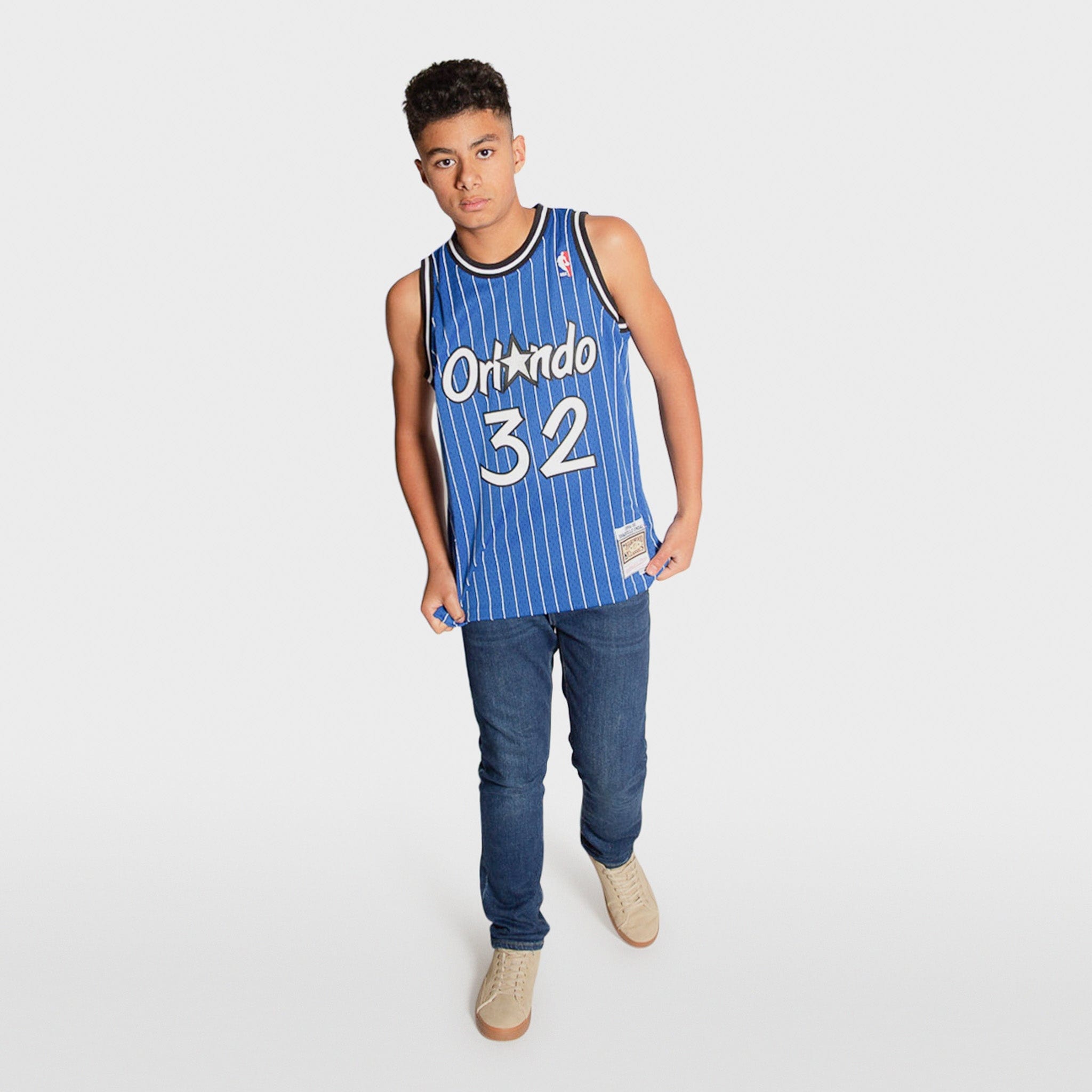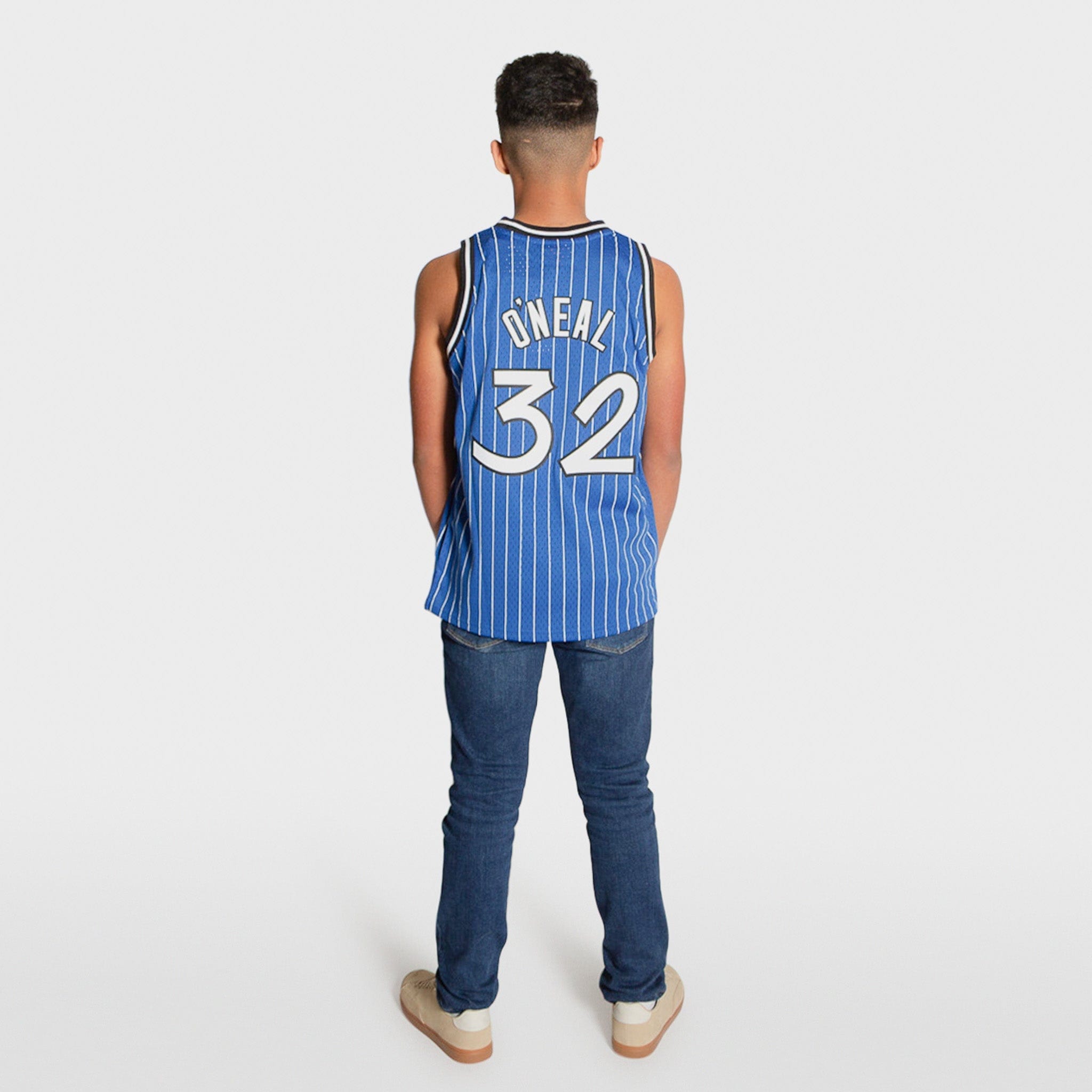Inspired by the jerseys worn by the legends of the NBA, this NBA Hardwood Classic Throwback Blue Pinstripe Swingman jersey is constructed to resemble the way Shaquille O'Neal wore his jersey during the 1994-1995 season with the Orlando Magic. Whether it’s playing an evening pickup game or wearing to your favorite team’s next matchup, this jersey is crafted with a wearable everyday fit, featuring stitched name & numbers and a mesh body for breathability throughout activity. This jersey is sized for youth/kids; women may need to size down accordingly based on length and fit.
