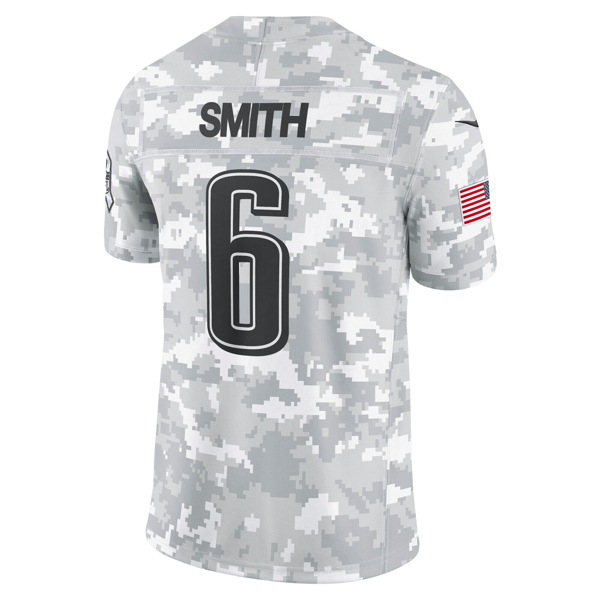 This DeVonta Smith Salute to Service Limited Jersey delivers an authentic touch on game day with premium twill team appliques and a tribute to those who serve their country. Its special design is dedicated to the NFL's charitable initiative and features an allover arctic camo pattern and military-inspired details. Double pique fabric and sweat-wicking Dri-FIT technology provide consistent comfort as you represent the Philadelphia Eagles and active or retired service members. The NFL does not profit from the sale of Salute to Service products. Charitable contributions are awarded by the NFL Foundation to the NFL's military partners. For more information, please visit www.NFL.com/Salute.