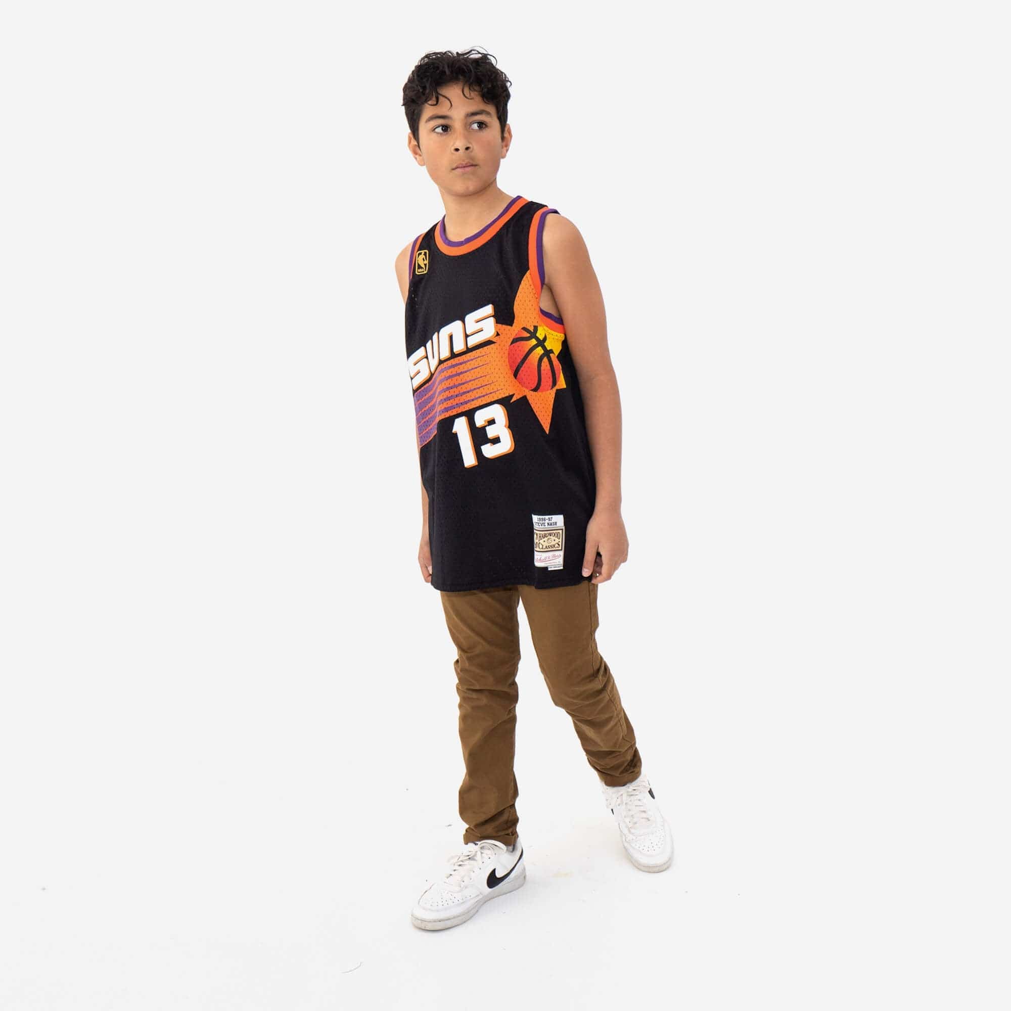 Inspired by the jerseys worn by the legends of the NBA, this NBA Hardwood Classic Throwback Black Swingman jersey is constructed to resemble the way Steve Nash wore his jersey during the 1996-1997 season with the Phoenix Suns. Whether it’s playing an evening pickup game or wearing to your favorite team’s next matchup, this jersey is crafted with a wearable everyday fit, featuring stitched name & numbers and a mesh body for breathability throughout activity. This jersey is sized for youth/kids; women may need to size down accordingly based on length and fit. Rep Steve Nash with this Phoenix Suns HWC Mitchell & Ness Youth NBA Black Swingman Jersey.
