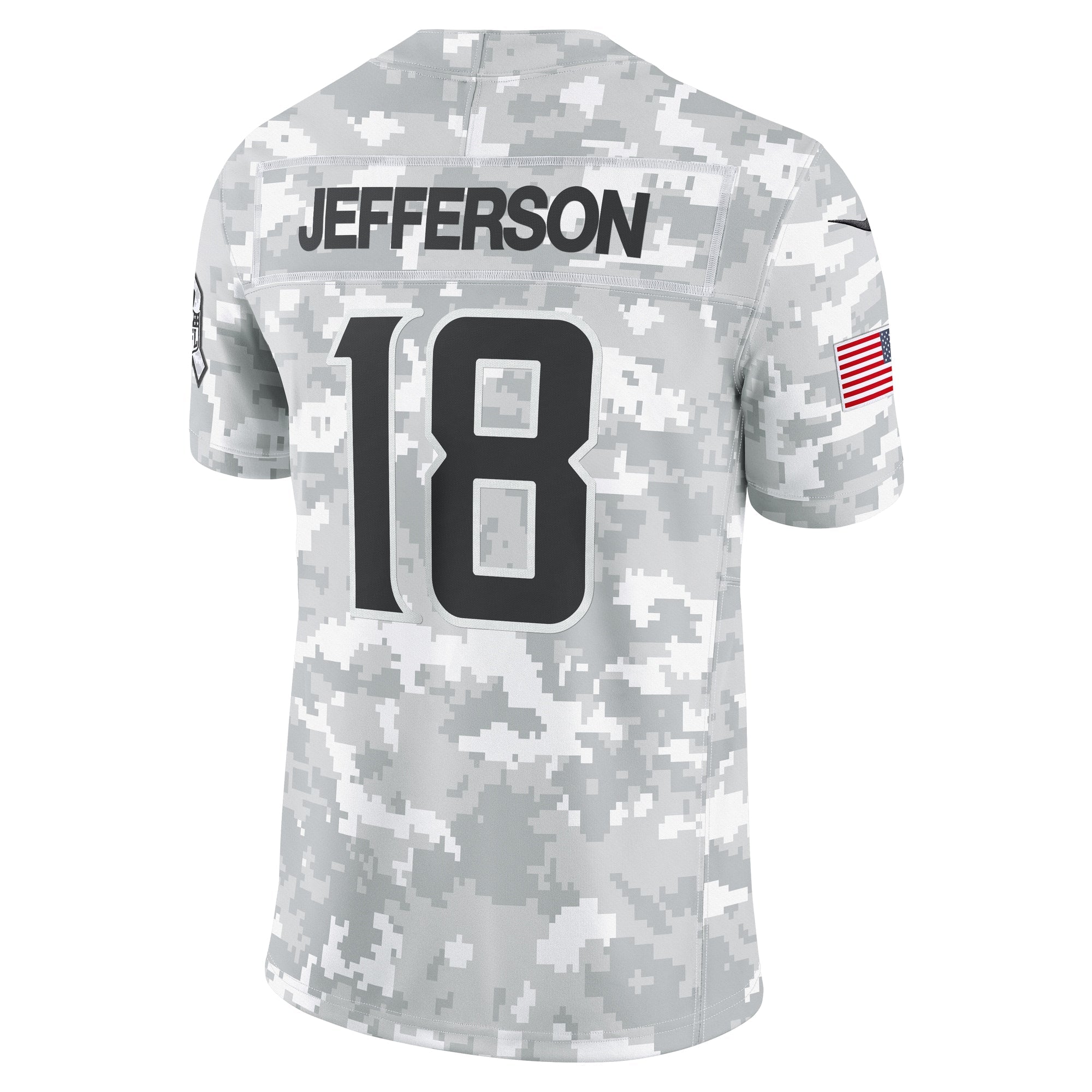 This Justin Jefferson Salute to Service Limited Jersey delivers an authentic touch on game day with premium twill team appliques and a tribute to those who serve their country. Its special design is dedicated to the NFL's charitable initiative and features an allover arctic camo pattern and military-inspired details. Double pique fabric and sweat-wicking Dri-FIT technology provide consistent comfort as you represent the Minnesota Vikings and active or retired service members. The NFL does not profit from the sale of Salute to Service products. Charitable contributions are awarded by the NFL Foundation to the NFL's military partners. For more information, please visit www.NFL.com/Salute.