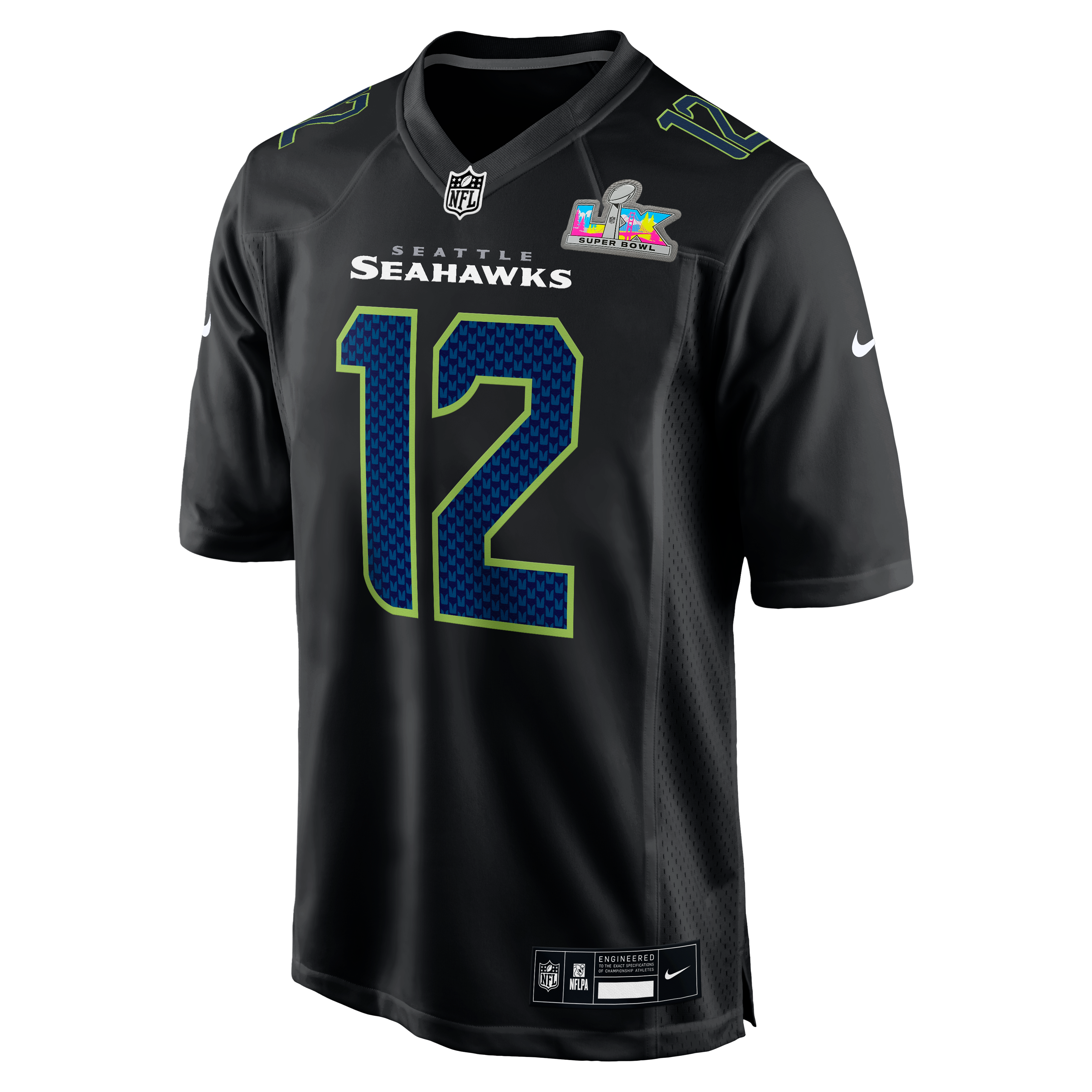 Men's Seattle Seahawks 12s Black Super Bowl LX Patch Carbon Fashion Game Jersey