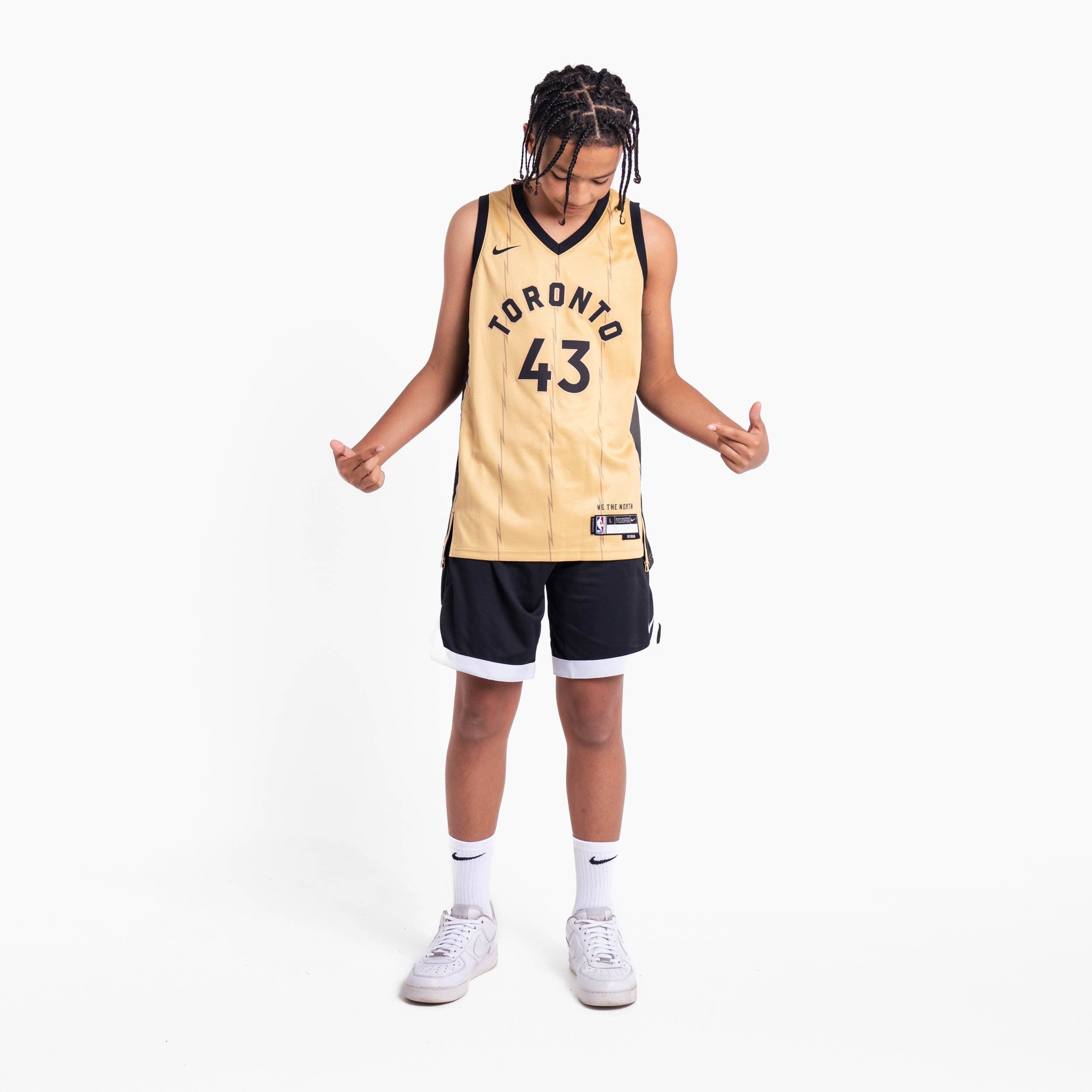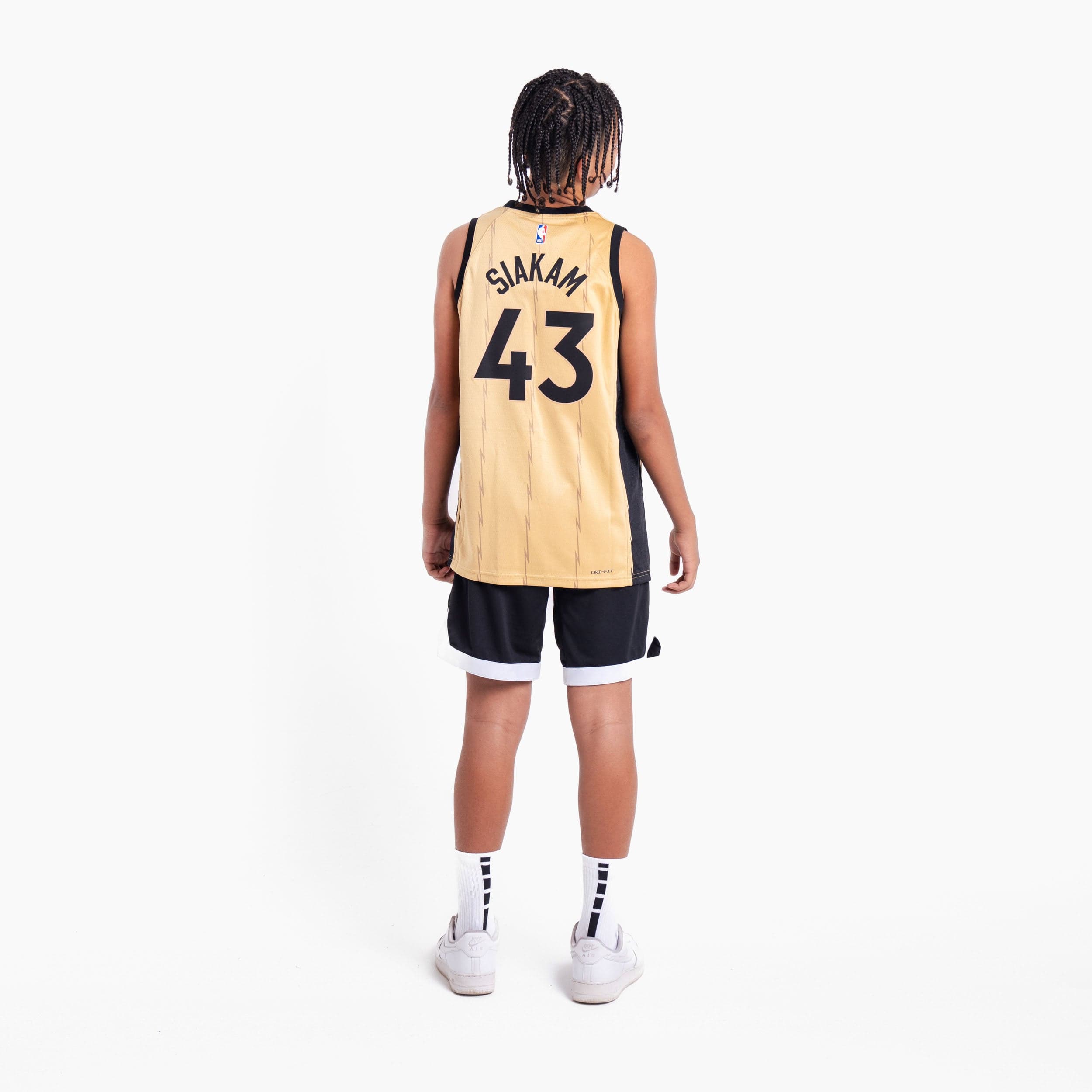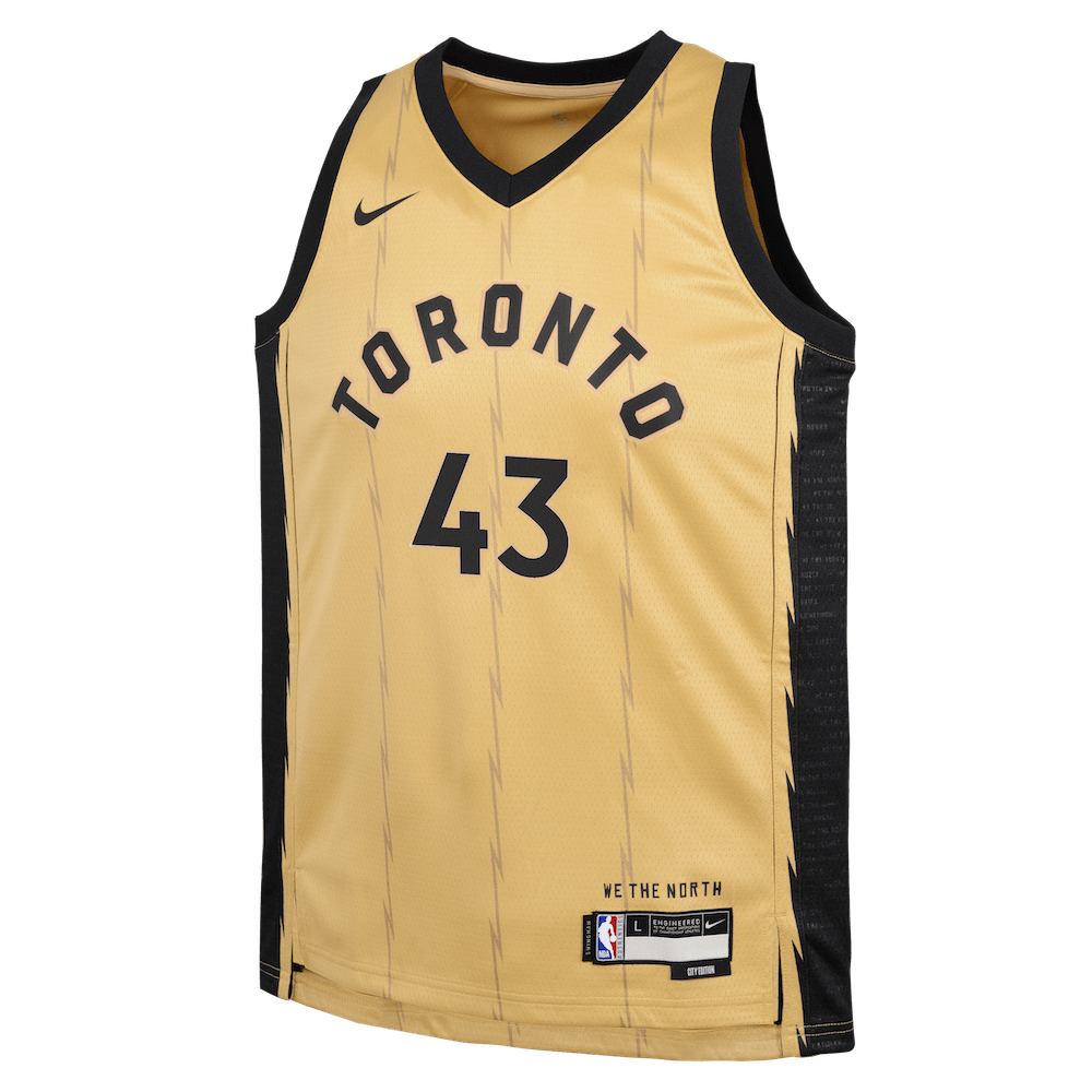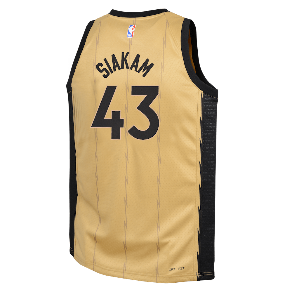 Have your little ballers rep their squad and cheer on their favourite star with the Pascal Siakam Toronto Raptors 2023-2024 City Edition Swingman Youth Nike NBA Gold Swingman Jersey, which features sweat-wicking double-knit fabric that is lightweight yet durable - designed specifically to help keep the little ballers cool, heat applied twill name and numbers with no stitch as well as design details that demonstrate your love for the game!